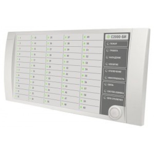"С2000-БИ" предназначен для работы в составе ИСО "Орион" совместно с пультом контроля и управления "С2000" ("С2000М") и отображения с помощью встроенных индикаторов и звуковой сигнализации сообщений о событиях в 60 разделах системы.