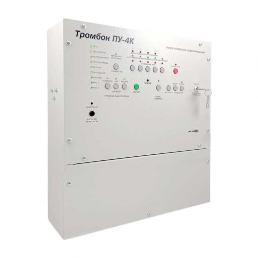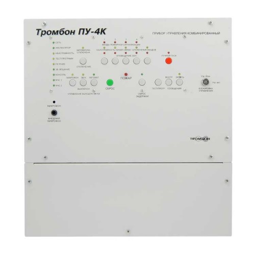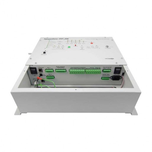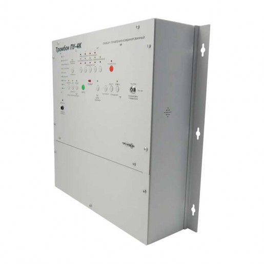 Приборы управления Тромбон ПУ-4К предназначен для построения системы оповещения и управления эвакуацией (СОУЭ) 3-го и 4-го типов. Оснащен встроенным усилителем мощности, системой резервного питания, двумя входами МЧС, гибкими настройками алгоритмов оповещения, интеллектуальной системой контроля всех линий связи, портом для подключения удаленных консолей Тромбон УК, интерфейсом RS-485 для подключения к ПК и сопряжения с системой безопасности АРМ "Орион Про".