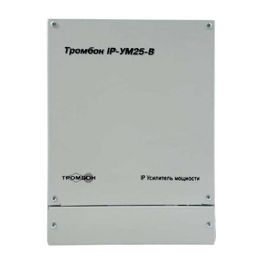 Усилитель мощности «Тромбон IP-УМ25-В» предназначен для работы совместно с пультом звукового вещания «Тромбон IP-ПЗВ», блок оповещения «Тромбон IP-БО8» и модуль сопряжения с каналами связи МЧС «Тромбон IP-МЧС». Усилитель мощности предназначен для приёма голосовых, звуковых, тревожных и иных сообщений от пультом звукового вещания «Тромбон IP-ПЗВ», блоков оповещения «Тромбон IP-БО8» и модулей сопряжения с каналами связи МЧС «Тромбон IP-МЧС», декодирования, усиления и воспроизведения на оконечные устройства – речевые оповещатели.
